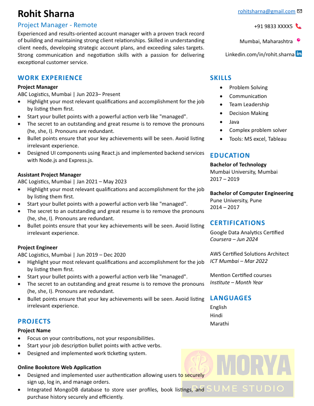 Modern ATS Resume Template without Photo – 1 Page, Optimized for a 90+ ATS Score
